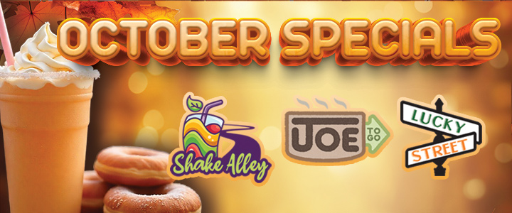 Dining Specials, Promotions & SpecialsOctober 1, 2025October 1, 2025 Shake AlleyCaramel Apple milkshake $9Pumpkin Pie milkshake $9Apple Cider slushy $9Apple Cider slushy with Apple Cider doughnut $11 Joe To GoPumpkin bars $5Apple Cider doughnuts one for $2 or six for $10 Lucky StreetPumpkin bars $5
